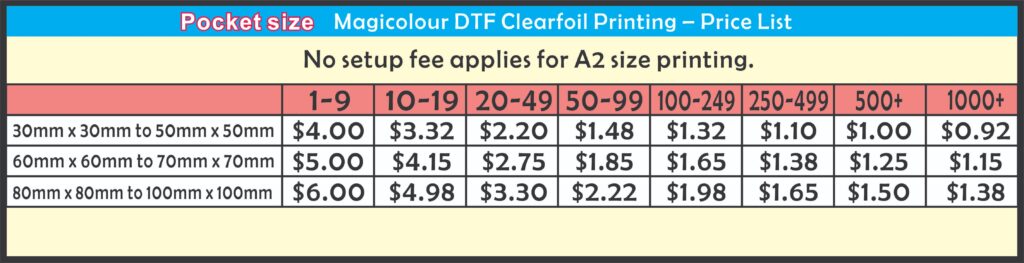 Pocket Size Magicolour DTF Clear Foil Printing Service – We print your file, you press! – Price starts from $0.92 each